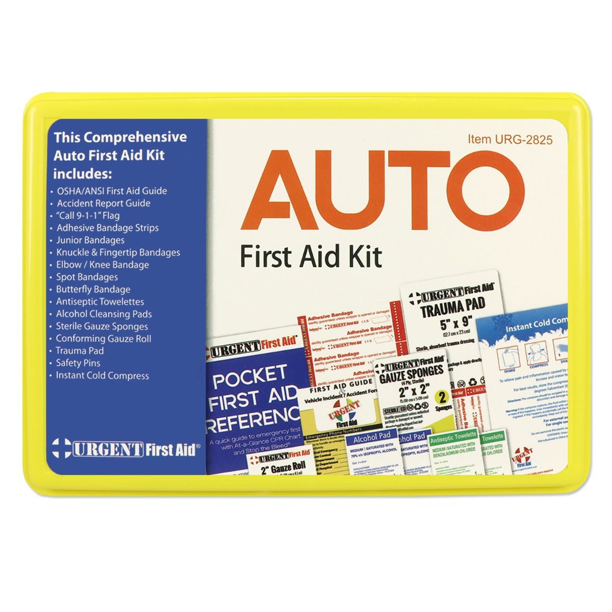 This kit was designed to have all the items you may need. The 40+ pieces fit in a small profile sturdy plastic box and include a surprising assortment of first aid items: instant cold pack for bumps, bruises, sprains and strains, antiseptic cleansing wipes and towelettes, ointments for treating open wounds, gauze roller conforming bandage, sterile pads and sponges for covering larger areas, pain relievers, a thorough first aid guide with instructions on caring for all types of illnesses and injuries, plus a variety of bandage sizes for different cuts, scrapes and lacerations – even thoughtfully packaged with hard-to-find knuckle, fingertip, elbow, knee, butterfly, and spot/coverlet bandages!